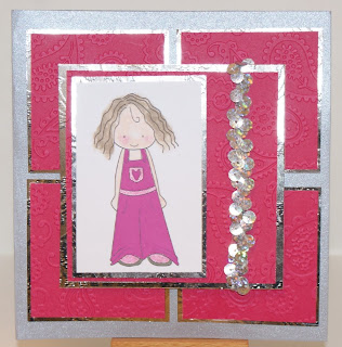 Texture is this weeks theme over at Creative Card Crew so I had a little play with my cuttlebug and the paisley folder for the backers then I layered them onto some lovely textured mirri card and added a yummy thread of silver sequins just to make sure I had enough lol The image is coloured with sakura pens and prisma pencils for the skin tone. I did try Lorraine's water colouring technique with them but didn't have much success:( but I'll try again at some point no doubt.