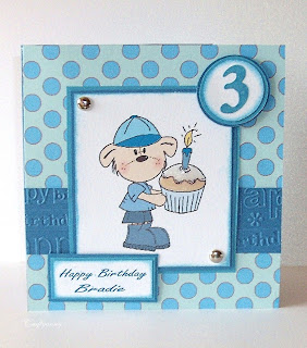 I forgot I had this little cutie from Pollycraft, just the job for a childs card, the papers are from their kids range too. Believe it or not I've covered 4 challenges out there in blogland so am rather pleased with myself as I've been struggling to make anything at all these past few days.
