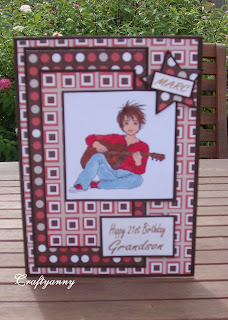 I've only covered one challenge with this one. Papers, well you know those 12x12 books you buy that the cover falls off and you don't know who makes them. This is one of them lol but they do make a great male card. Image is Mikey from Charmed Crafts & Cards coloured with copics, I'm slowly but surely gathering these up. All I need to do now is learn how to shade better with them lol