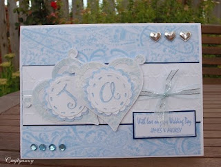 I cut everything on this one with my circut, a mix of carts, mounted it onto some white card which I'd run through the cuttlebug with the hearts folder and finished it off with some sheer ribbon, a few blue gems and some fabric hearts I've had since the year dot.